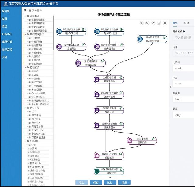 银行信用评分卡是银行根据客户的相关数据去评价用户风险得分的重要工具,得分的高低会直接影响到用户的授信额度。传统的评分卡建立流程需要业务人员和开发人员合作,业务人员梳理业务、开发人员编辑代码,整个过程耗时长、人员参与多、沟通成本大。 利用大数据可视化分析平台,用户可以方便快捷地将用户流水数据、用户资产负债数据、央行征信数据导入。在无需编程的情况下,用户通过拖拽分组聚合算子求出用户6个月的流水总额,并对表中的缺失字段进行填充。通过数据集的连接构建出可以用于建模的数据,将该数据与逻辑回归相连接并进行预测打分,最终评估准确率,构建完毕的模型可以一键保存部署上线,帮助银行对用户信用风险进行打分。