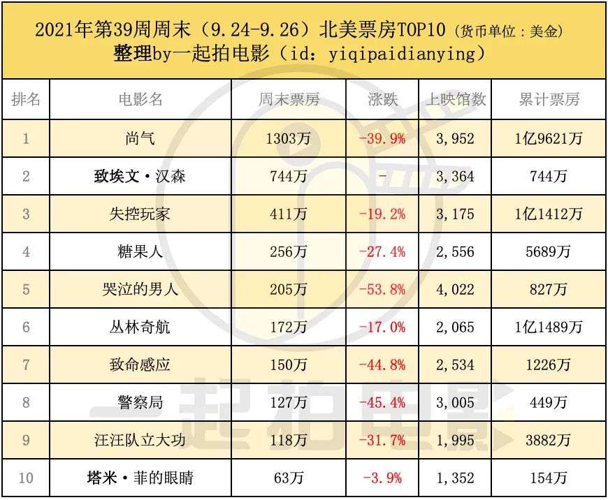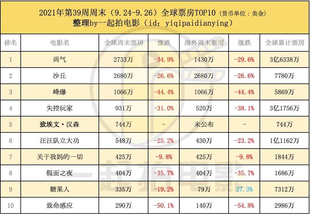 上周末全球票房大盘创下本轮疫情恢复期以来最低记录,其中内地仅有 2500万美元,北美不足4000万美元,全球更是跌破1亿美元。 不过好在国庆档期将来,各路大片现身银幕,市场预计将会有非常强烈反弹本周末大盘有望超过3亿美元。