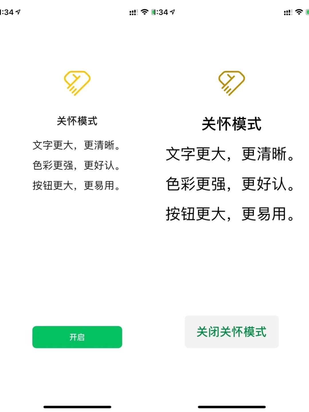 这两个功能诞生各有背景。“关怀模式”开启后,微信字体变得更大,色彩更浓,功能按钮更大,主要针对老年人群体设置。