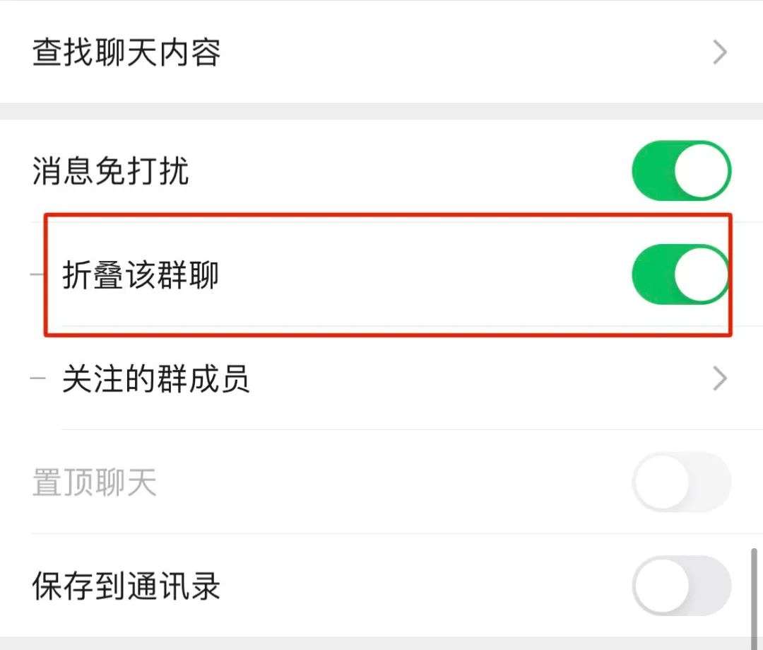 此次更新的另一个重点功能是群折叠,进入某个群,点开群设置,找到消息免打扰,打开此项功能后便能选择是否“折叠该群聊”。“关注的群成员”与此项功能并列,群成员设为关注后,该成员在群内发消息会提醒你关注,不受到免打扰的影响。最多可关注4个群成员。