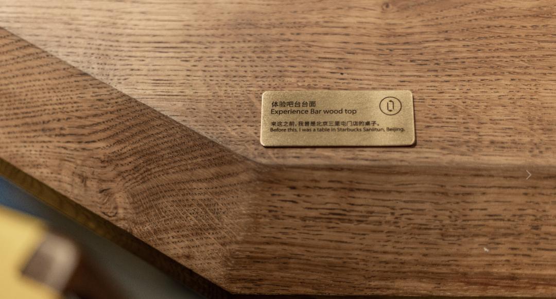 在店里随意坐下,就会发现很多充满故事的细节,比如体验吧台桌面、木制阶梯踏板,都是星巴克北京三里屯门店重装时拆下的。认真看,还有三里屯门店设计师的印章。