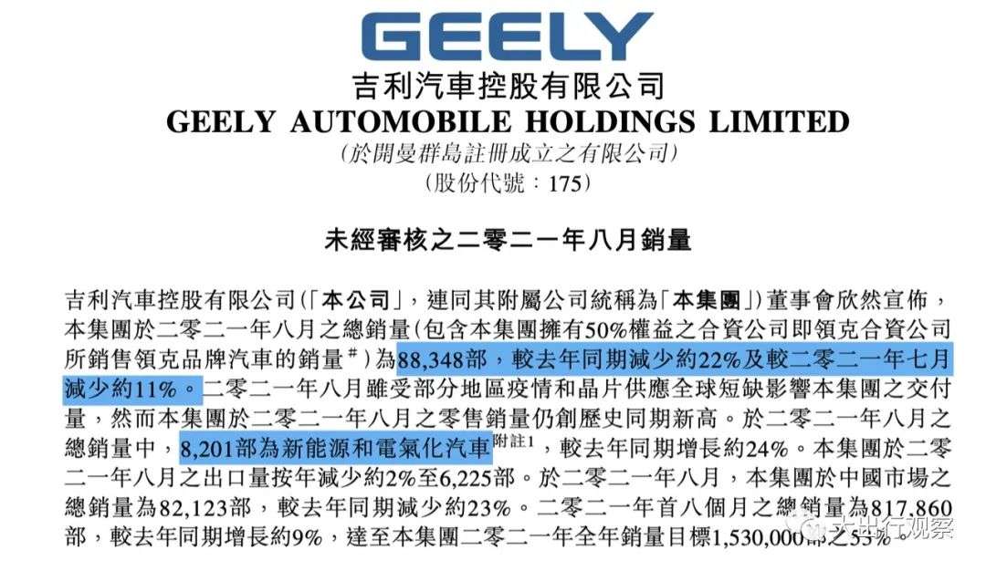 今年8月,吉利汽车称,完成汽车总销量88348辆,同比减少约22%,环比减少约11%。而比较关键的新能源汽车,销量仅8201辆,占总销量不到10%。值得注意的是,吉利汽车在新能源领域的主销车型,帝豪EV,更多的是由旗下曹操出行进行“内部消化”。