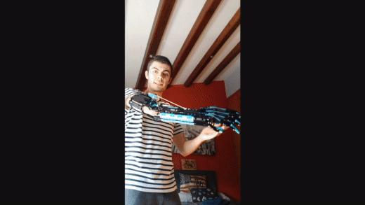 玩了4年乐高之后,9岁的大卫开始探索用乐高制作自己的义肢,当然,正如上图中展现的那样,那时候大卫只能用胶带将乐高零件绑到自己的右臂上,这个义肢并不具有实际的功能。