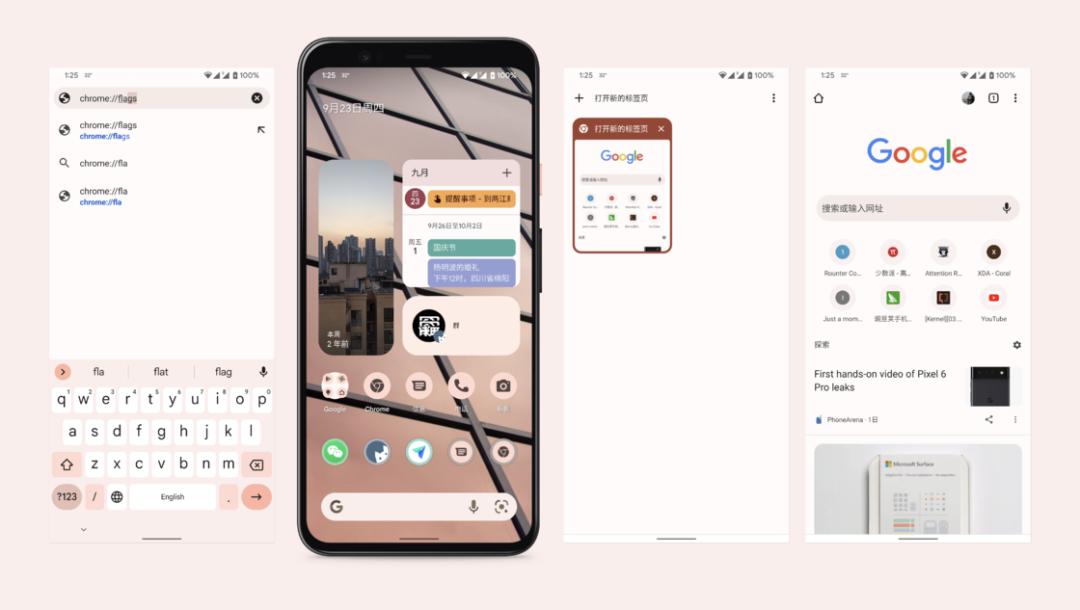 地址栏背景、选词高亮背景、标签页预览卡片边框、设置菜单……Chrome 94 中不少浏览器组件都会从 Android 12 的壁纸中提取色彩,让浏览器与系统之间的观感体验更加和谐一致。不过这些新变化在 Chrome 94 也并非是直接开启的,依旧需要通过手动启用Dynamic colors on Android和Theme refactor on Android两项功能标签来手动开启。
