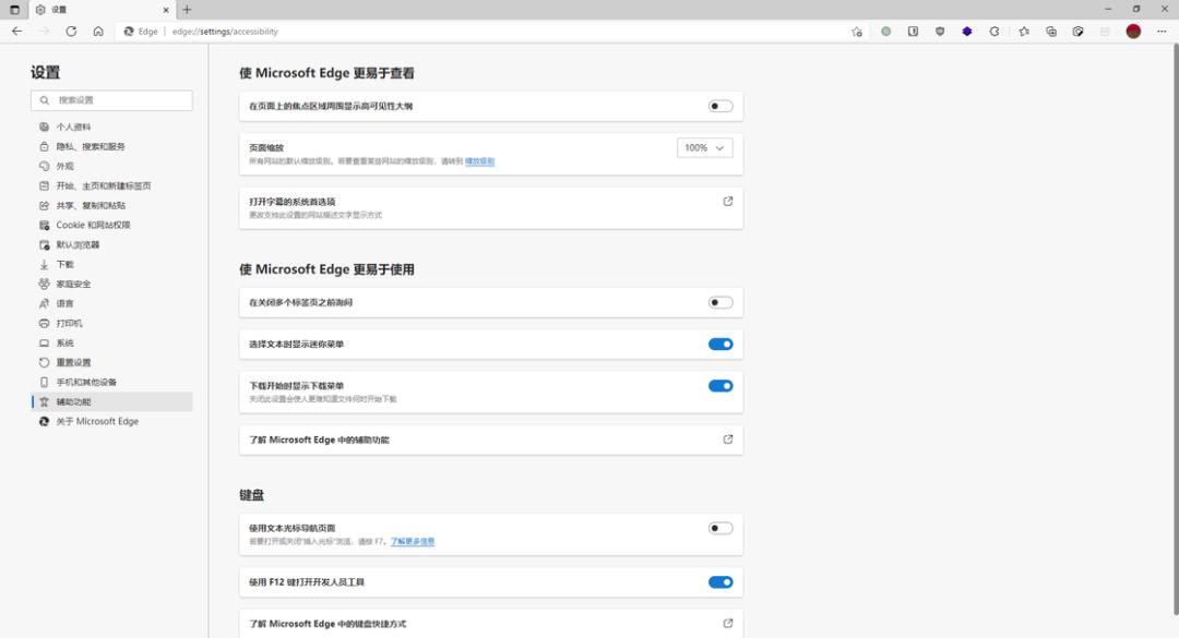 在「使 Microsoft Edge 更易于查看」这个部分中,我们可以调整页面缩放、打开字幕的系统首选项以及在页面焦点区域周围显示高可见性大纲;而「使 Microsoft Edge 更易于使用」这个部分则提供了在关闭多个标签页之前进行询问、选择文本时显示迷你菜单、下载开始时显示下载菜单等选项。