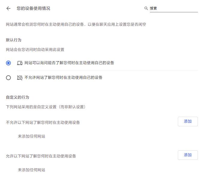 简单来说,通过这个 API 浏览器可以判断用户当前是否有浏览动作,并通过 API 接口向开发者提供这一状态信息,因此也很有可能被滥用。这一 API 在 Chrome 94 稳定版中默认启用,如果你对这一数据较为敏感,不妨在网站权限控制中对「您的设备使用情况」一项勤加检查。