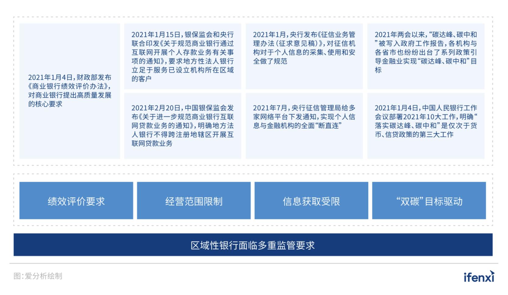 《报告》分析:一是区域性银行本身的“区域化特质”限制,不能出圈意味着总客群就那么多;二是政策层层加码,对区域性银行的规划化运营、评价指标体系、风控管理等提出了更高的要求;三是“双碳”目标驱动,对区域性银行开展绿色信贷业务提出了要求。