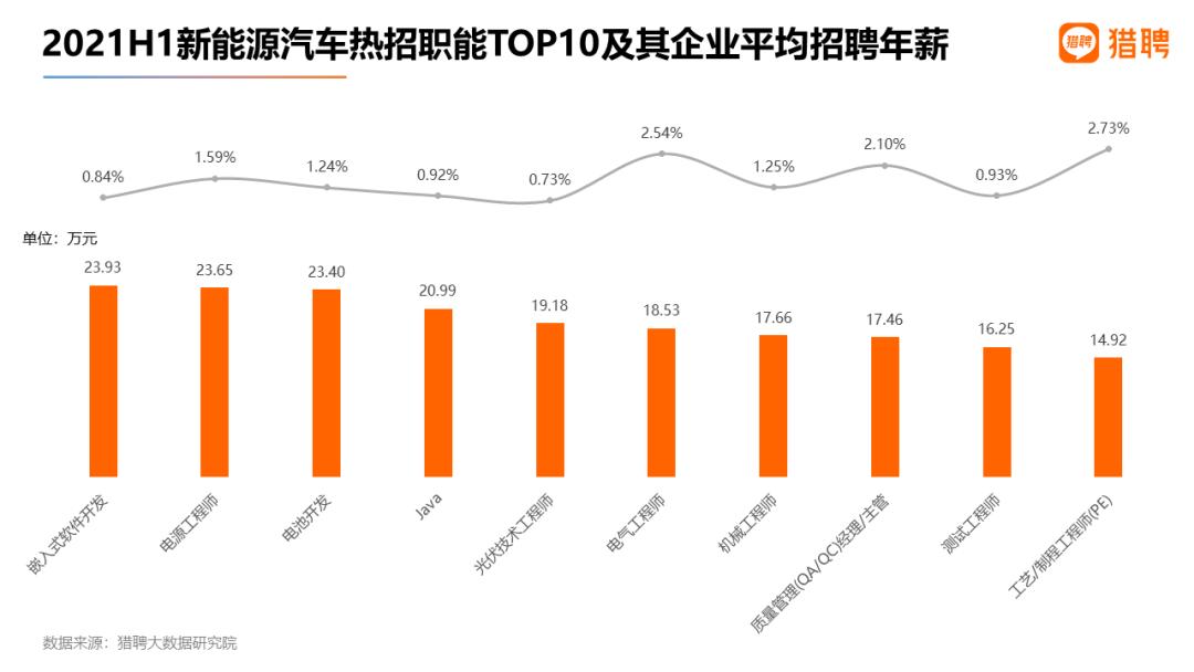 广阔的新能源汽车市场,使得人才争夺战愈演愈烈。 根据猎聘发布的2021上半年中高端人才就业数据报告,新能源汽车领域2021上半年新发职位比2020年同期上升94.54%,比2019年同期上升 60.12%。其企业平均招聘年薪也从2020年的17.47万元上升到2021上半年的18.96万元。