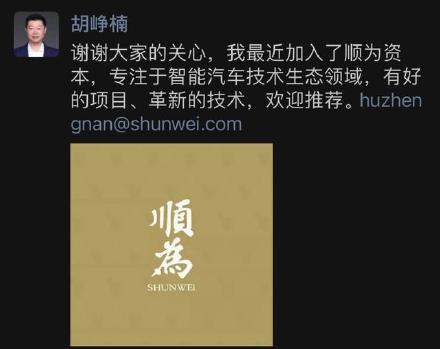 9月7日,原吉利研究院院长胡峥楠在微信发了一个朋友圈,称近期加入了小米旗下的顺为资本,专注智能汽车技术生态领域。这无异于给汽车圈丢了一个“重磅炸弹”。