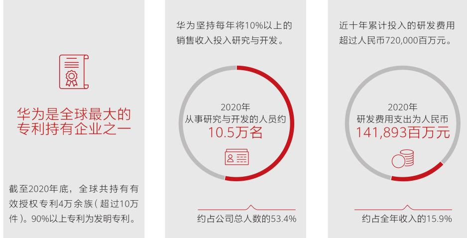 在巨大的研发投入下,华为是全球最大的专利持有企业之一,截至2020年底,全球共持有有效授权专利超10万件,超90%的专利为发明专利。
