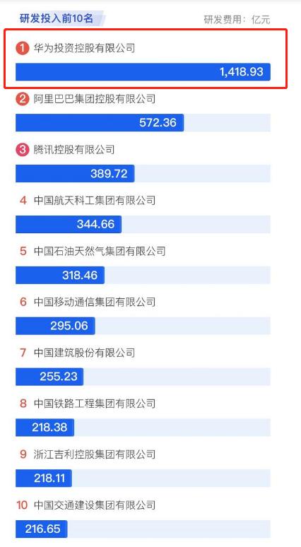 而在近日公布的2021中国企业500榜单榜单显示,在研发投入和发明专利数量排名方面,华为均位列第一。
