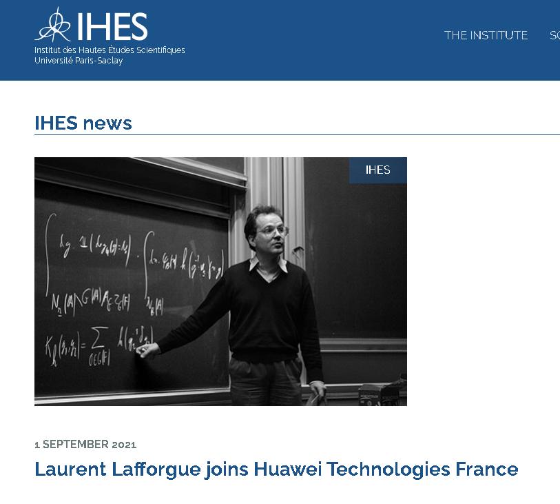 巴黎萨克雷大学( IHES )官网显示,9月1日起,数学最高奖菲尔兹奖得主、法国数学家洛朗・拉福格加入华为团队,在华为开展数学研究。