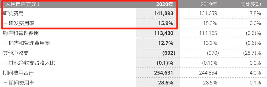 年报中表示,华为2020年坚持对5G、云、人工智能及智能终端等面向未来的研究创新,及保障业务连续性等方面持续投入,研发费用率上升0.6个百分点。