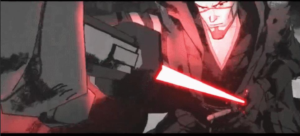 短片集里一致评价最高的作品是神风动画制作的《决斗》。《决斗》将星战元素与黑泽明电影风格进行有机结合,星战角色代入到日本武士形象中,高对比度的复古黑白片风格强化光剑的红色光芒,将日式传统剑戟片刀剑相交铮音回响,荡气回肠的特点体现得淋漓尽致,是一部令人眼前一亮的短片。