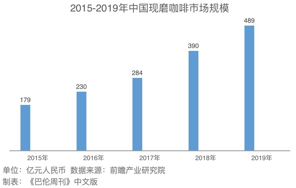 彼时,中国现磨咖啡市场的潜力正在膨胀——星巴克门店数量朝着4000家迈进,瑞幸即将成立,肯德基的老对手麦当劳也已让McCafé(麦咖啡)进军中国。据前瞻产业研究院的统计,中国现磨咖啡市场在2015年到2019年间增长迅猛。