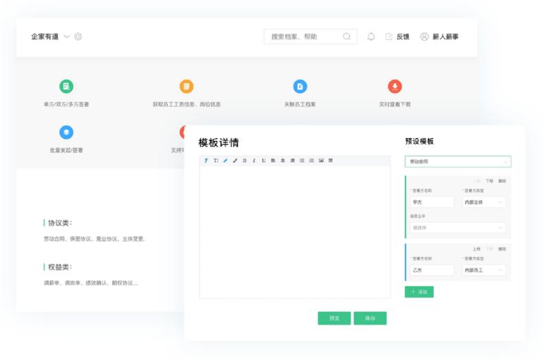 薪人薪事人力资源云系统支持电子合同,实现高效管理,AI智能入职,自动采集员工基础信息,合规高效签署电子合同,按时提醒续约。除此之外,各类工程管理、合同签署、流程文件等,均通过系统进行线上审批。