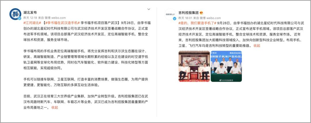 9月28日,根据湖北发布和吉利控股集团官方微博的公布,有如下关键信息:李书福正式进军手机领域,项目总部落户湖北武汉;定位高端智能手机,服务全球市场;同时在汽车智能化等方面互相赋能,实现协同。