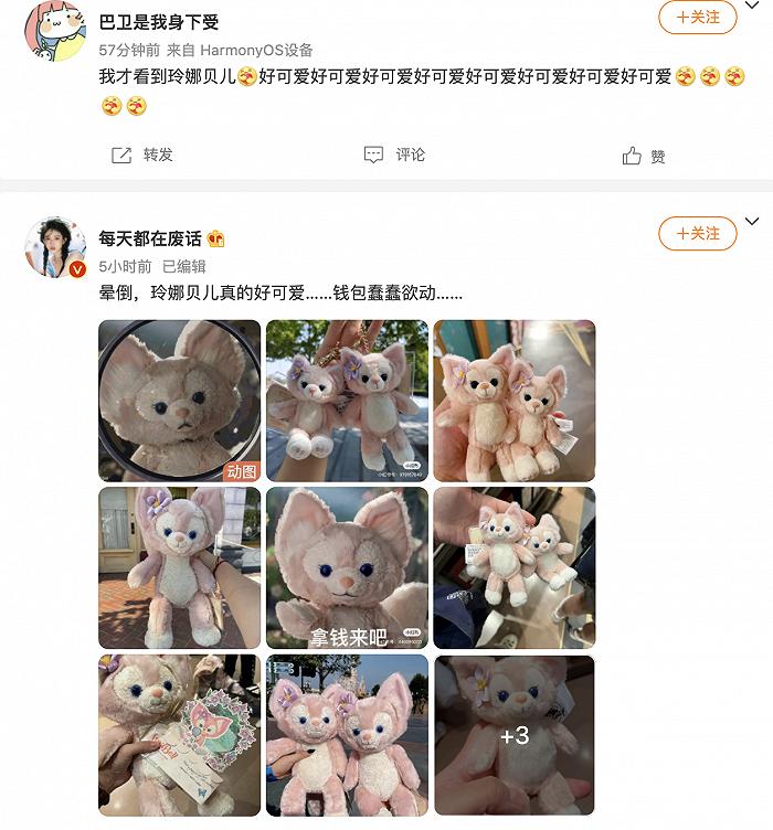 这些心理学理论多少解释了达菲家族为何能在迪士尼乐园——特别是中国和日本的迪士尼乐园中走红。它们的故事线并不如那些有作品的IP丰满,但并不妨碍年轻人在其身上寻找治愈感。在社交媒体中你往往能见到年轻女性感慨“它们太可爱了。”关于玲娜贝儿的微博讨论中,不少人称它是“宝贝女儿”“给妈妈一个机会买到你”。