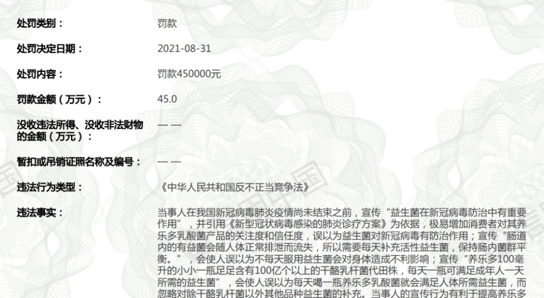 最近,养乐多被上海监管局一次性罚款45万元。
