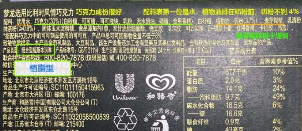 另一方面是营养成分。植物奶油制作中会产生反式脂肪酸,这种物质会增加心血管类的患病风险,长期食用会造成肥胖。那么,对于一支仅50-70克,售价10元左右的梦龙冰淇淋来说,消费者希望吃到的当然是性价比范围内的动物奶油,而不是便宜的植物奶油。