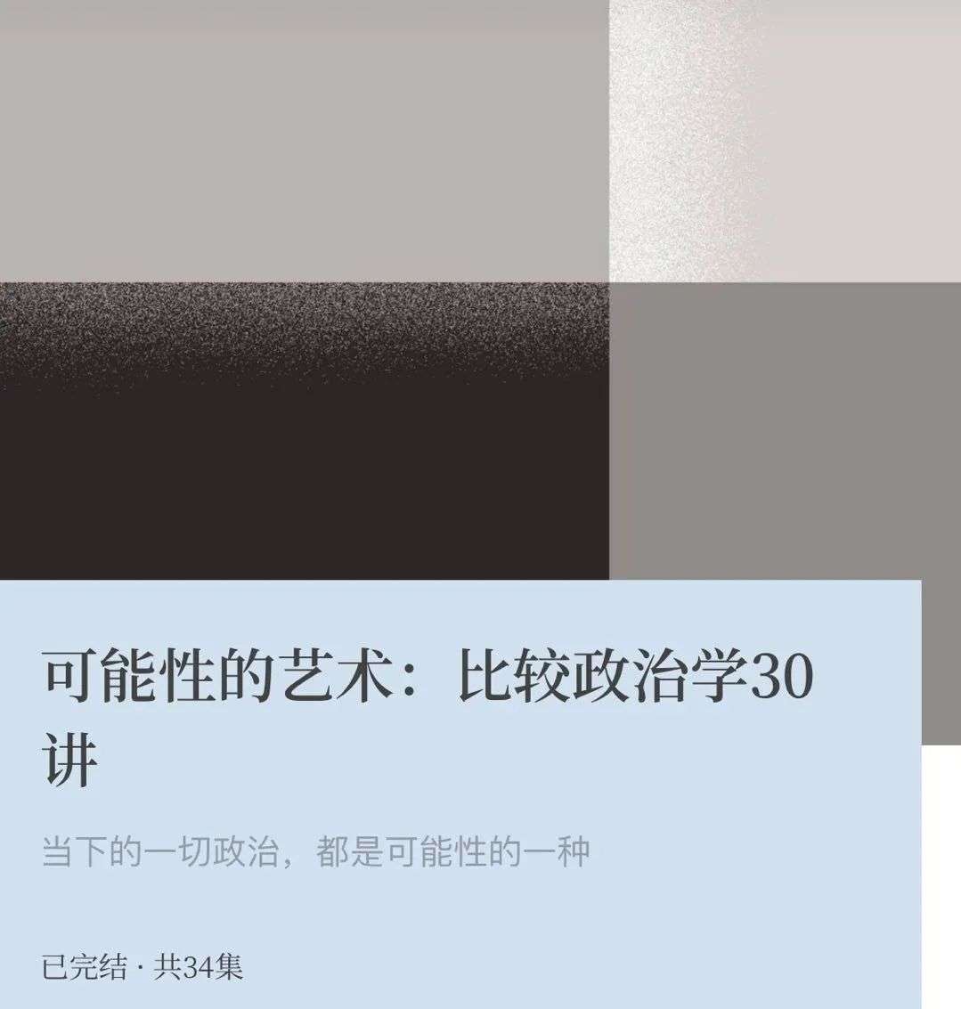 推荐语:你肯定能看出来,《可能性的艺术:比较政治学30讲》不是啥播客,它是看理想App里的一个付费音频,主讲人是刘瑜,哈佛大学博士后,现为清华大学人文社科学院政治系副教授,10年前,《送你一颗子弹》、《民主的细节》两本书,让她成为国内公共领域重要的声音之一。这个30讲的内容,陪伴了我足足近三周的上下班的路上,听得非常解渴,系统,清晰,去噪,且极其开视野。