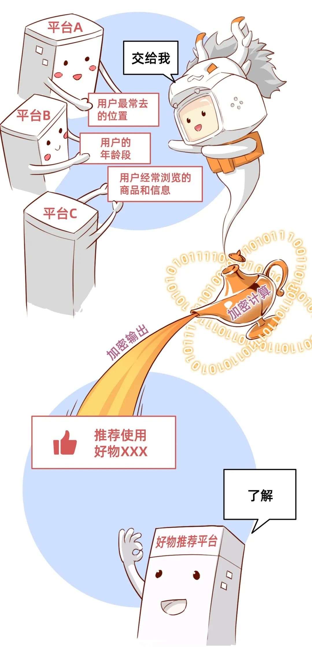 比如,有一家好物推荐平台希望跟多家公司合作,共享数据,计算用户画像跟消费习惯的如何匹配,但企业往往不想泄露用户隐私,这时候就可以用加密计算,在“神灯”里面算完,直接输出结果。