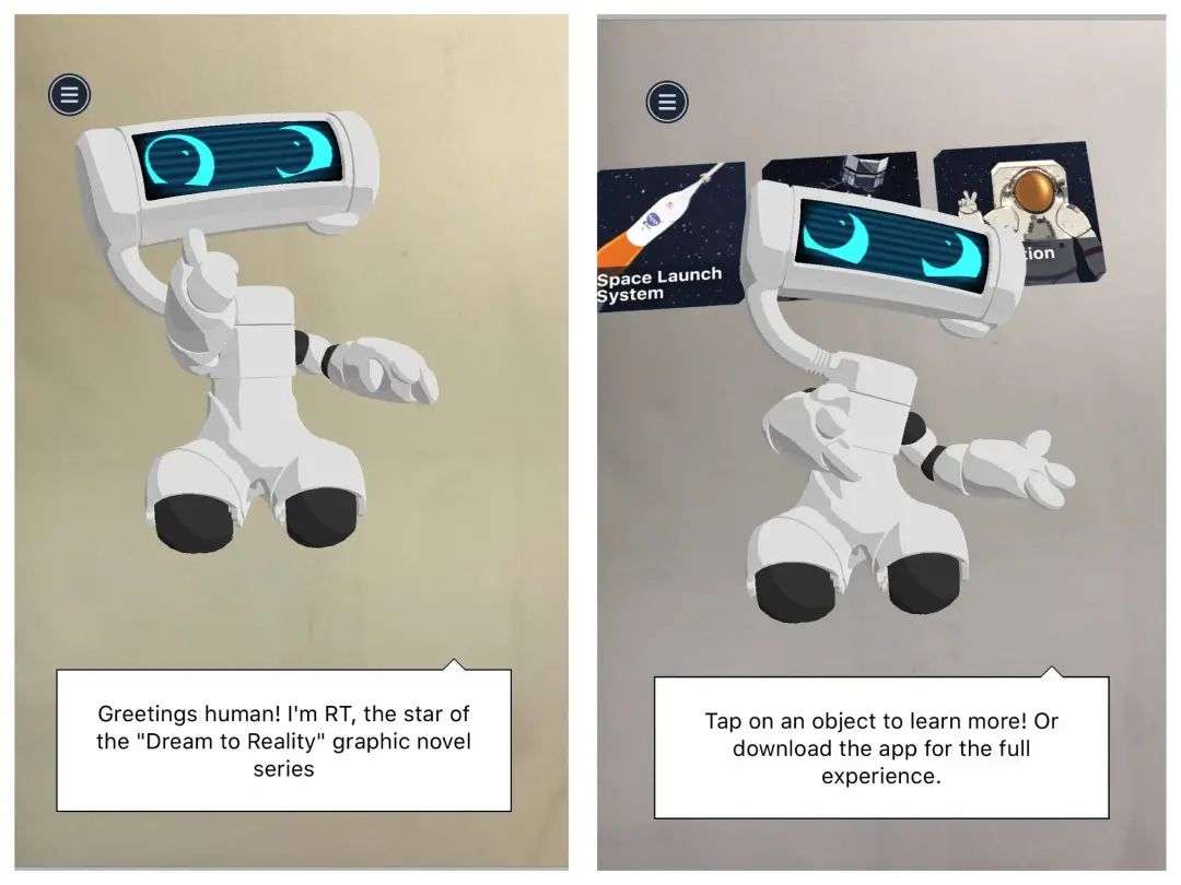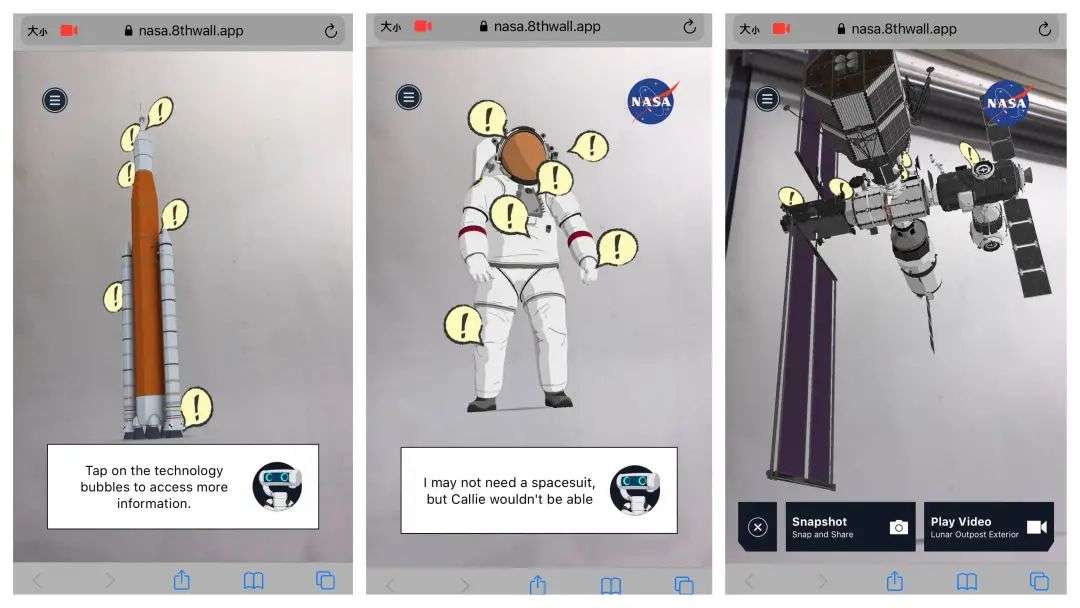 借助 AR 技术来到现实世界的 RT,会对着你做自我介绍,让你初步感受它在小说里的古怪个性和幽默细胞。紧接着,它的身后出现 3 个物体——宇航服、月球前哨、发射系统,点击图片就可以看到它们的 3D 形态。