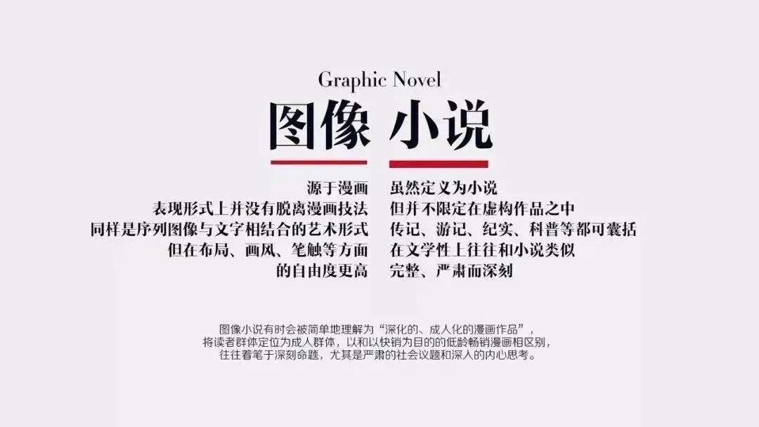 图像小说的定义比较宽泛,但它在概念上与漫画、卡通等有分别,按漫画史研究者史蒂芬·韦纳的话说是「有一本书的厚度、有完整故事的漫画......是使卡通具有文学作品特征的一种形式」。