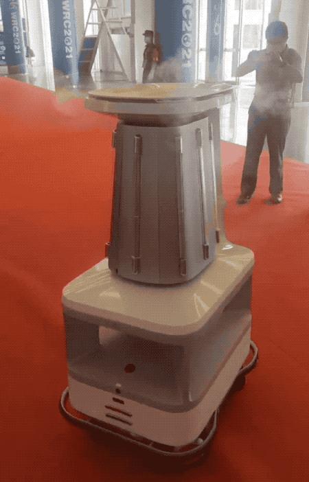 消毒巡逻机器人除了在自己的展位参展,还直接在会场上开始了工作。
