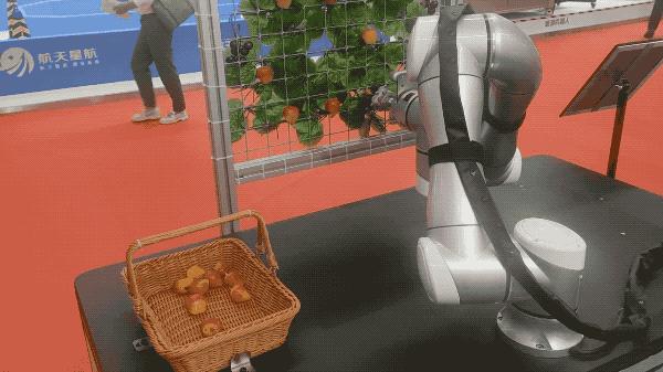 农业上有自动采摘机器人,抓取的部分是软管材质不会对水果造成损伤,不过此次现场演示的水果是道具。