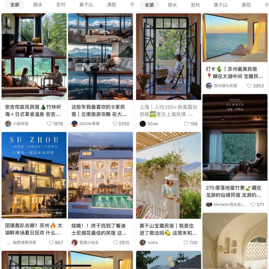 社交媒体已经成为民宿的关键营销渠道。例如在小红书上,有超过137万篇民宿相关笔记,返璞归真、亲近自然、遗世独立的民宿风格成为当下流行趋势,侘寂风、高级感、隐秘性等词汇出现频率较高,“润物细无声”地引导着用户消费认知并促成转化。