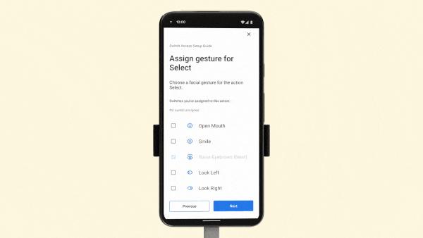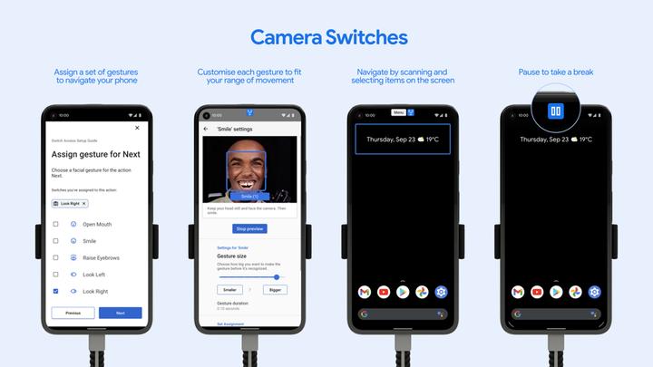 Google 在最新的无障碍套件中引入了一个新功能,他可以利用手机的前置摄像头,实时观察用户的面部表情,并能识别六种表情以实现不同的操作,包括:向左看、向右看、向上看、扬眉、微笑以及张嘴。