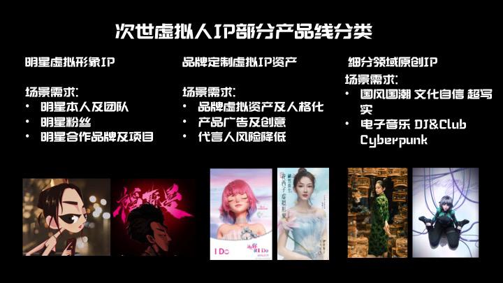 还有虚拟分身,比如说我们做的明星虚拟形象,以及游戏及品牌的数字资产、虚拟人。以后大家在聊到虚拟赛道的时候可以更精准的说,你喜欢的是某一个类型的产品当中的某一个角色,其实听起来会更专业一点点。
