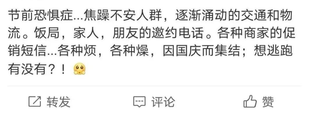 “10月1号是家庭聚会,七大姑八大姨的又见面了。说实话,我是真怕她们突然的关心。我单身没对象,你们给介绍么?工资不够花,你们给红包么?讨厌。”