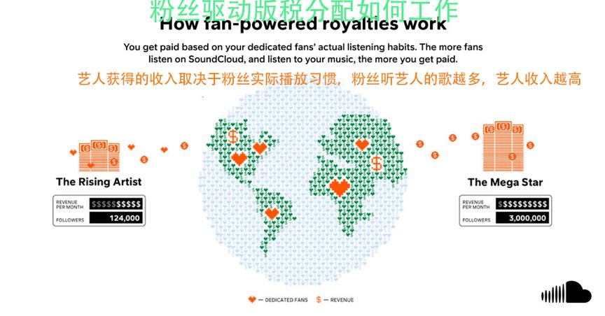 目前,粉丝驱动(Fan-powered)收入分配模式已经获得了很多方面的支持,7月,英国乐队 Portishead将其翻唱的《SOS》独家授权给SoundCloud,乐队成员杰夫·巴洛(Geoff Barrow )表示,当听说 SoundCloud 要转向一种更加公平的收入分配机制时,乐队非常高兴让 SoundCloud 成为其新歌的独家授权平台。