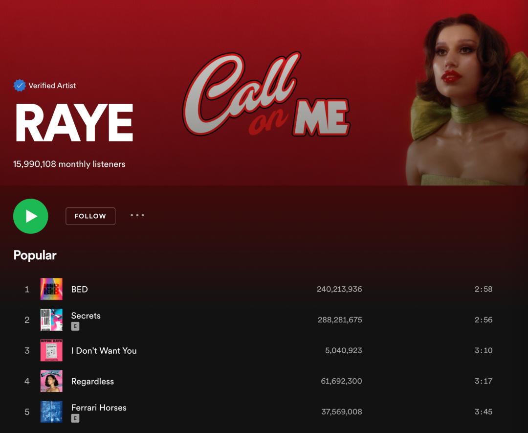 RAYE在Spotify上的月听众量超过1500万