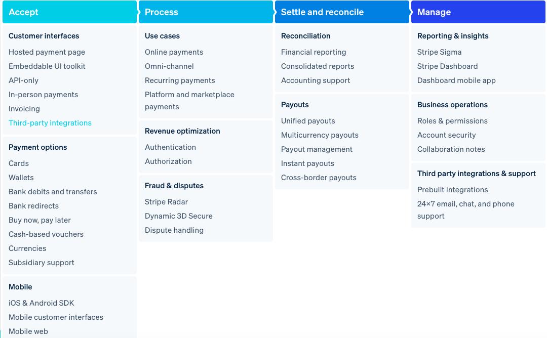 Stripe的产品事实上不只是前面所说的收付款服务,更包含了以下几个领域,可以说是Stripe的生态系。