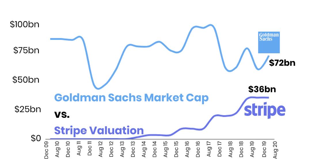 如今,高盛的市值仅为720亿美元,略低一些,而Stripe公司4月份的G系列扩展对高盛的估值为360亿美元。仅仅四个月后,360亿美元看起来就像偷来的。事实上,如果Stripe上市,它的价值将超过现在的高盛。