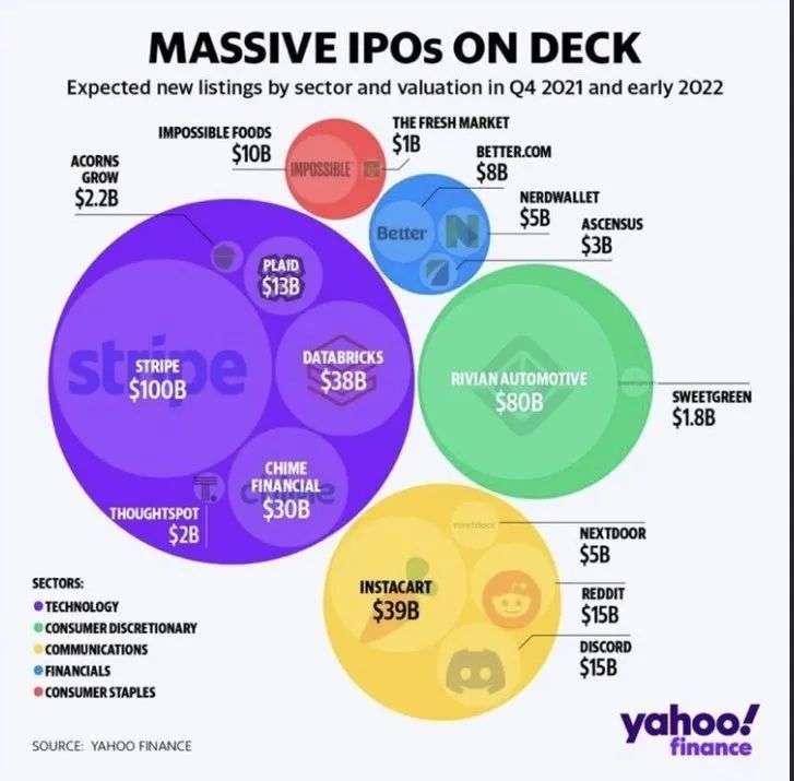 2021年最后4个月将有大约90至110宗美股IPO,2021年全年预计将有大约375宗IPO,融资总额达1250亿美元。如果预期偏差不大,2021年将成为有史以来融资总额最高的一年,也是自2000年互联网泡沫以来IPO数量最多的一年。