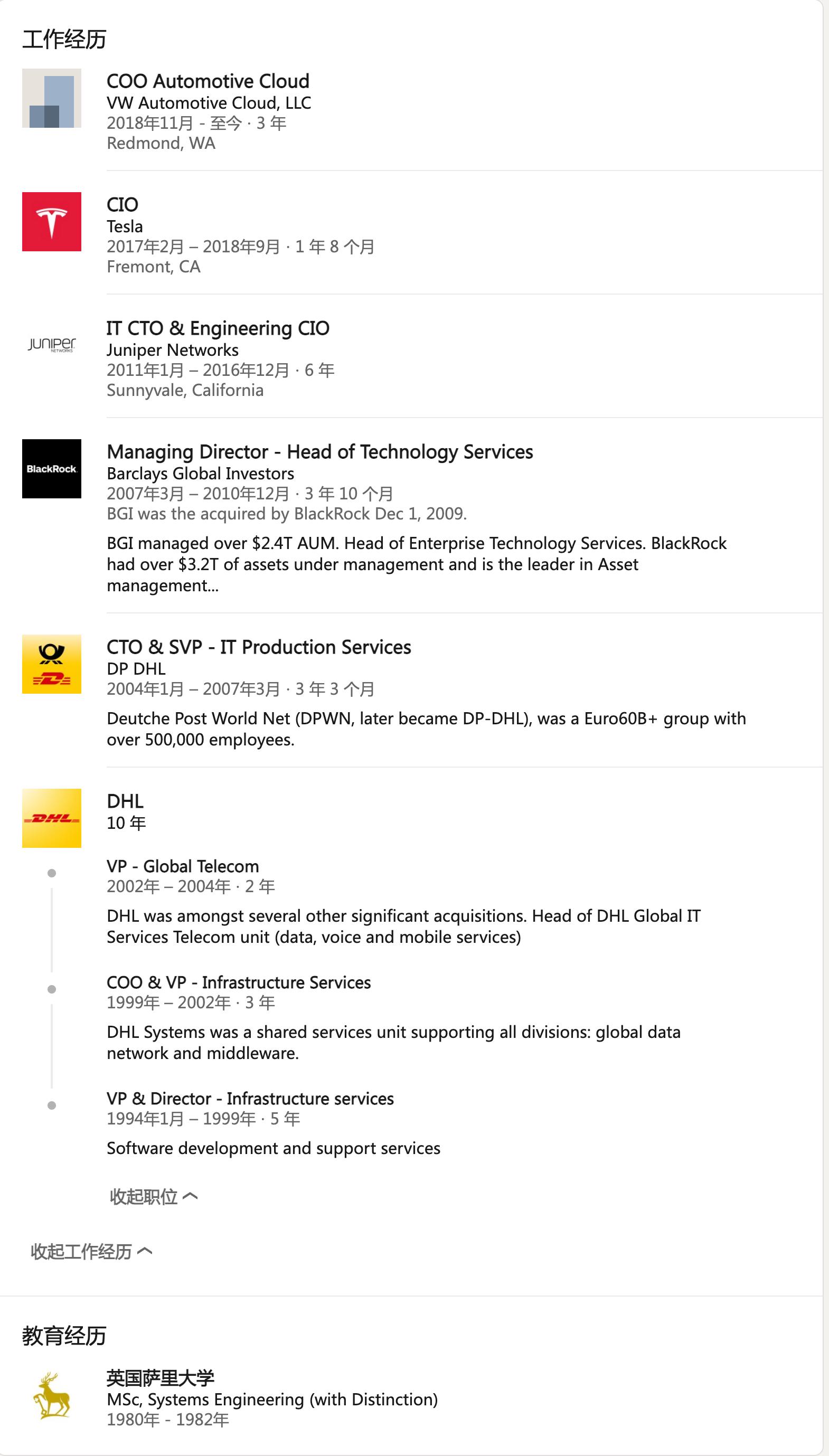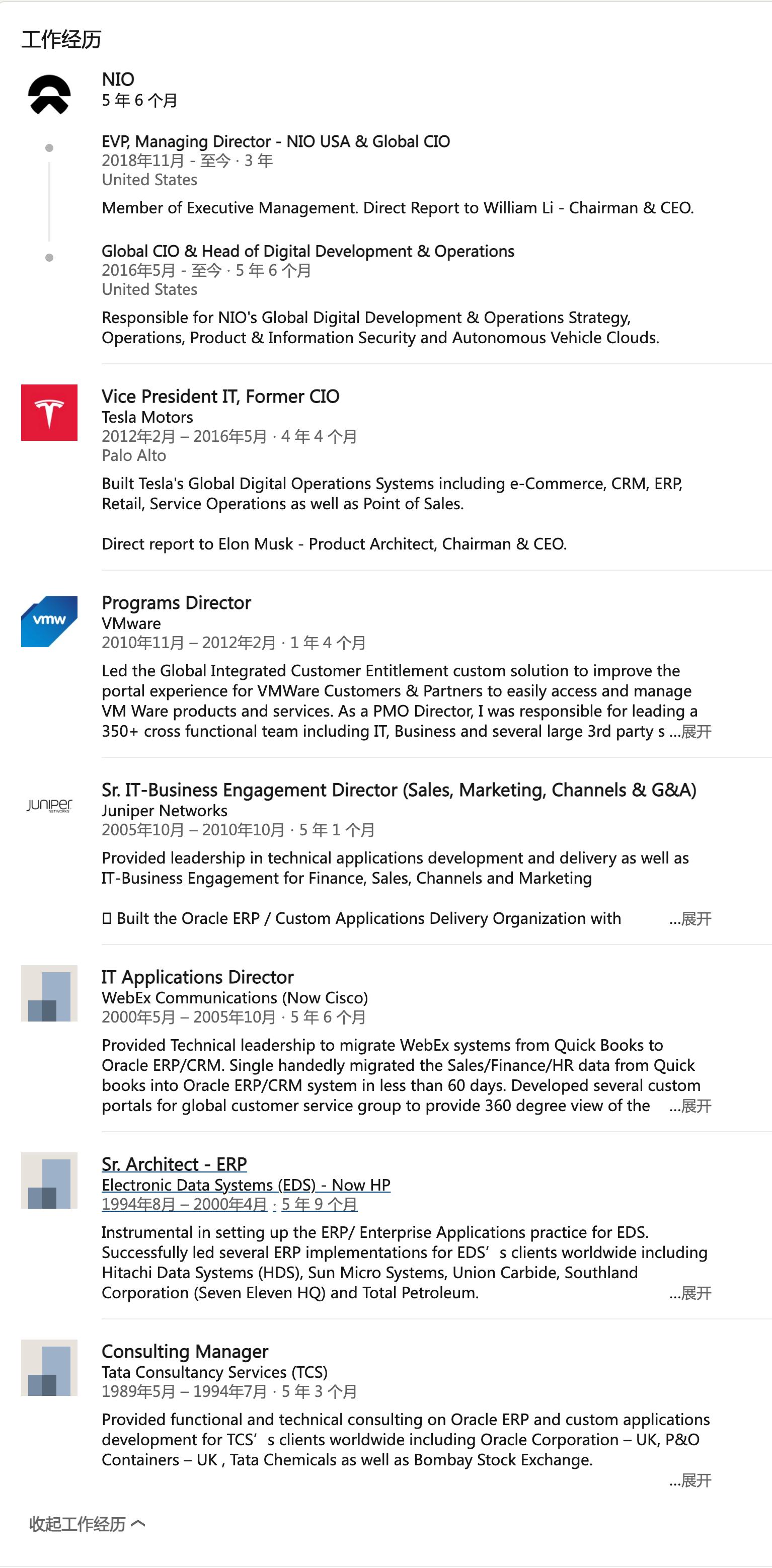 这位CIO被中国读者记住的另一个点是,在短暂的出任特斯拉的CIO后,2016年5月加入蔚来汽车,担任蔚来汽车CIO兼全球数字运营主管。
