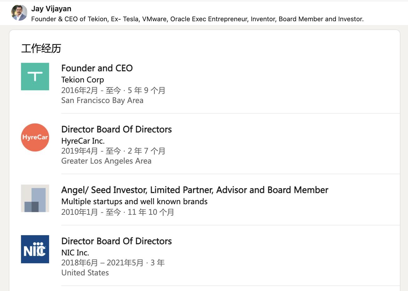 这种复合的背景很可能也使得Jay Vijayan有不错的管理能力和业务能力。2016年4月,Jay Vijayan 被媒体曝出从特斯拉离职。IT基础设施和运营副总裁Guru Sankararaman也追随Vijayan离开,后面出任了Tekion公司的联合创始人、CFO、运营VP。能够带走重要下属一起创业,大概率是业务能力、管理能力的证明。