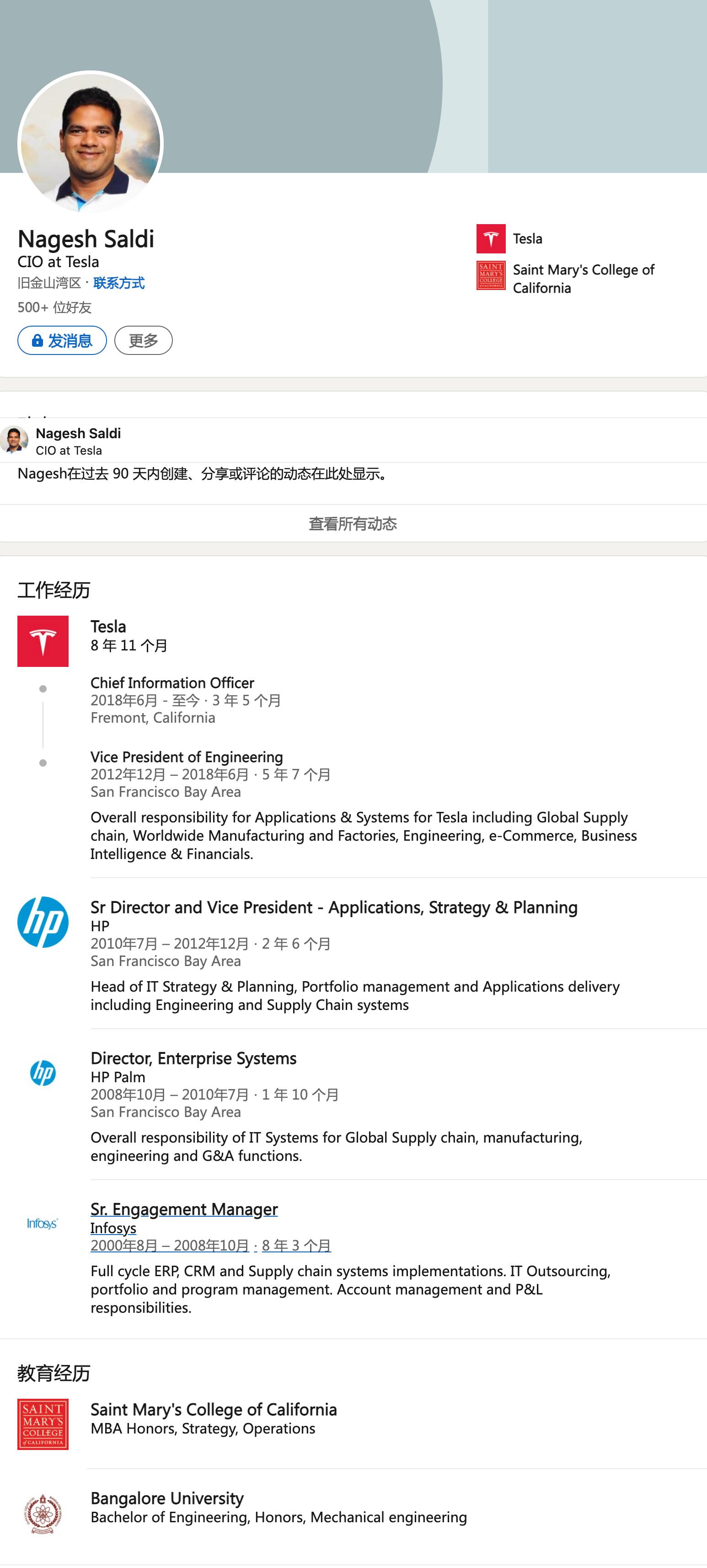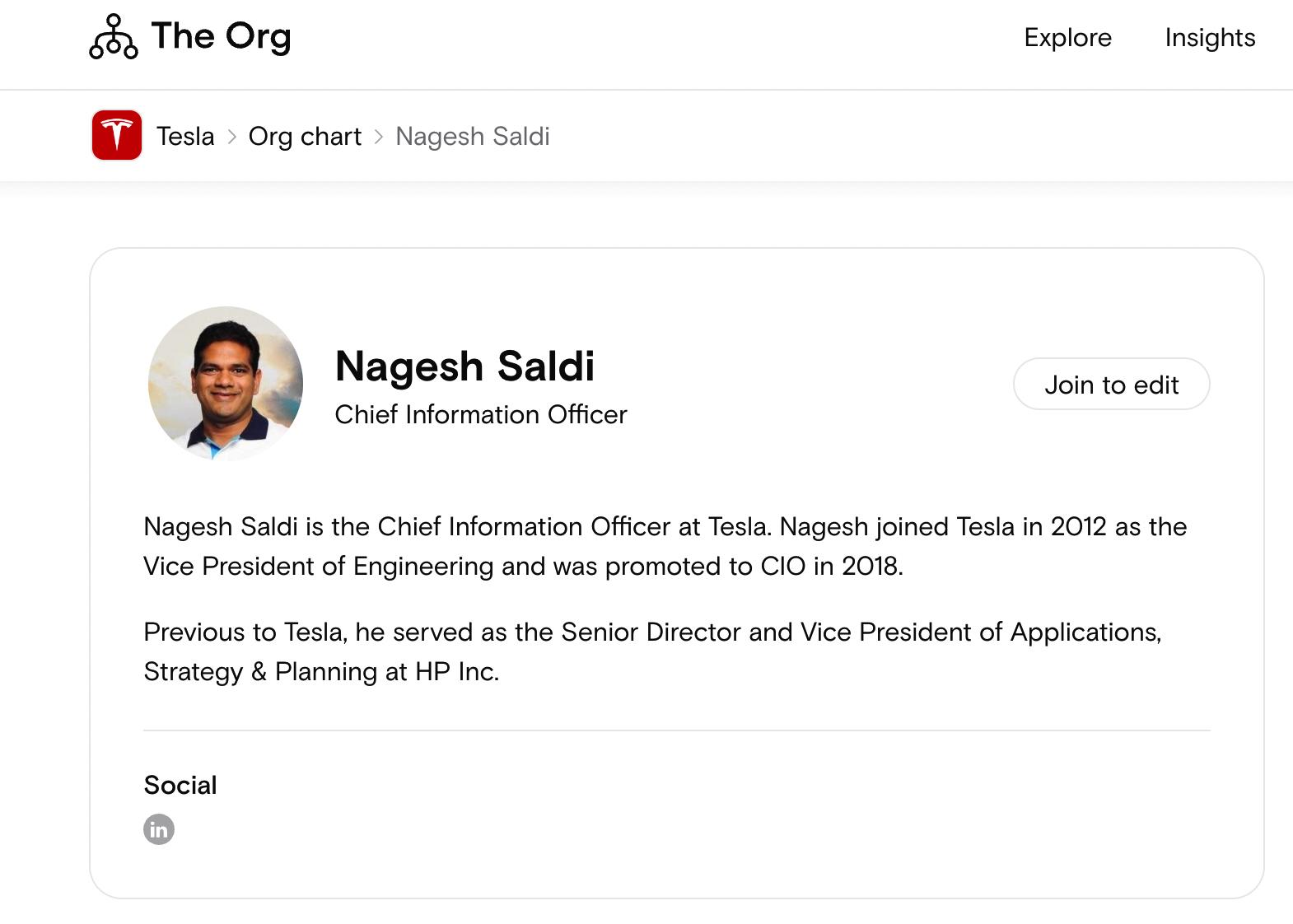 现在特斯拉的官网上,CIO 一栏的名字是Nagesh Saldi。