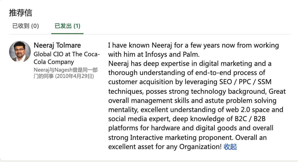 Nagesh Saldi在LinkedIn的推荐来自于可口可乐当前的CIO Neeraj Tolmare