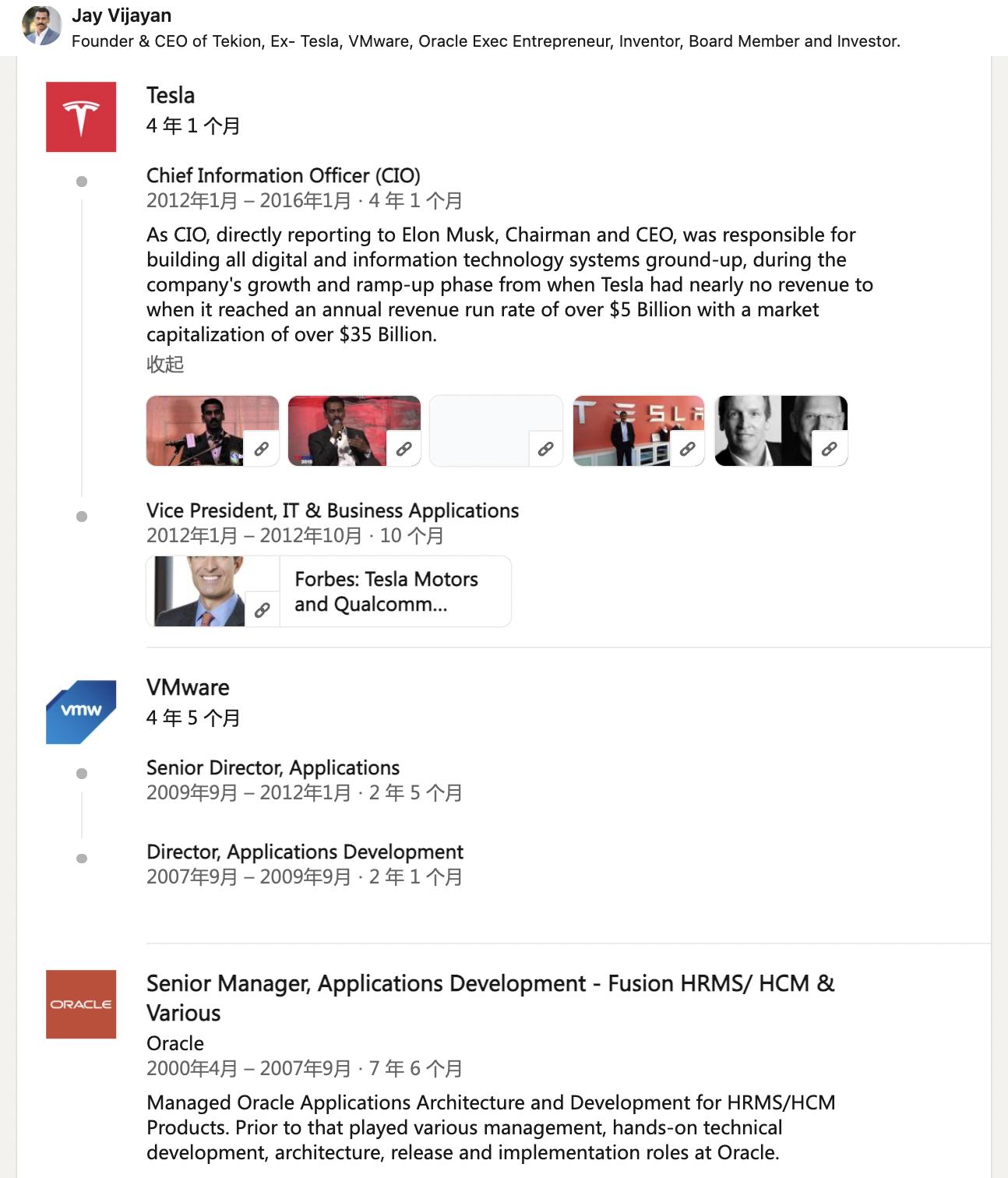 几任CIO任职时,均有超过10年的IT行业经验。可以说,特斯拉的CIO岗位并不相信“年轻有为”。毫无疑问,特斯拉以及知名的汽车主机厂,均不缺IT采购的预算与费用,之所以放弃采用成熟的商业软件,一定是因为业务的场景复杂度或者创新度高,市面上产品无法解决实际问题。历任CIO中,Jay Vijayan知名度最高,主要是因为从0到1打造了Warp系统,与其在Oracle和WMware十年的工作经验密不可分。