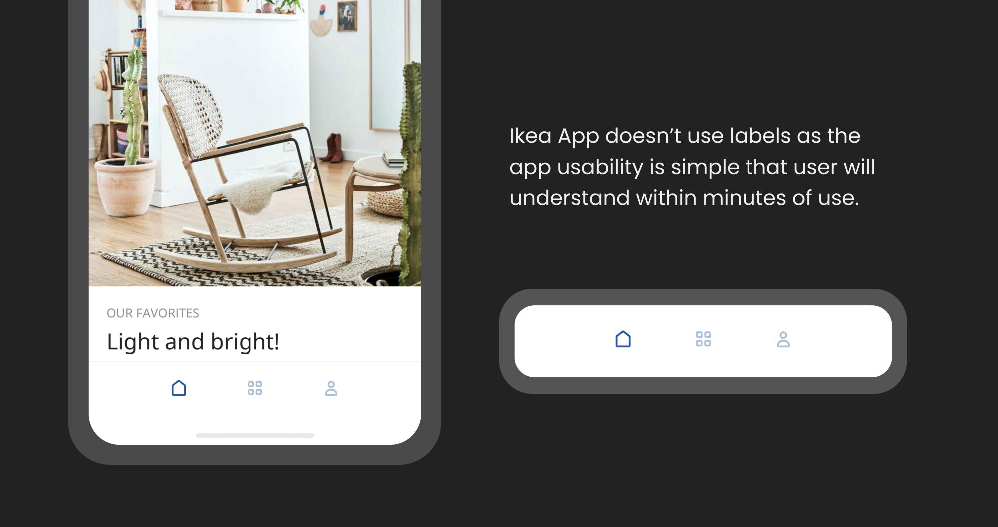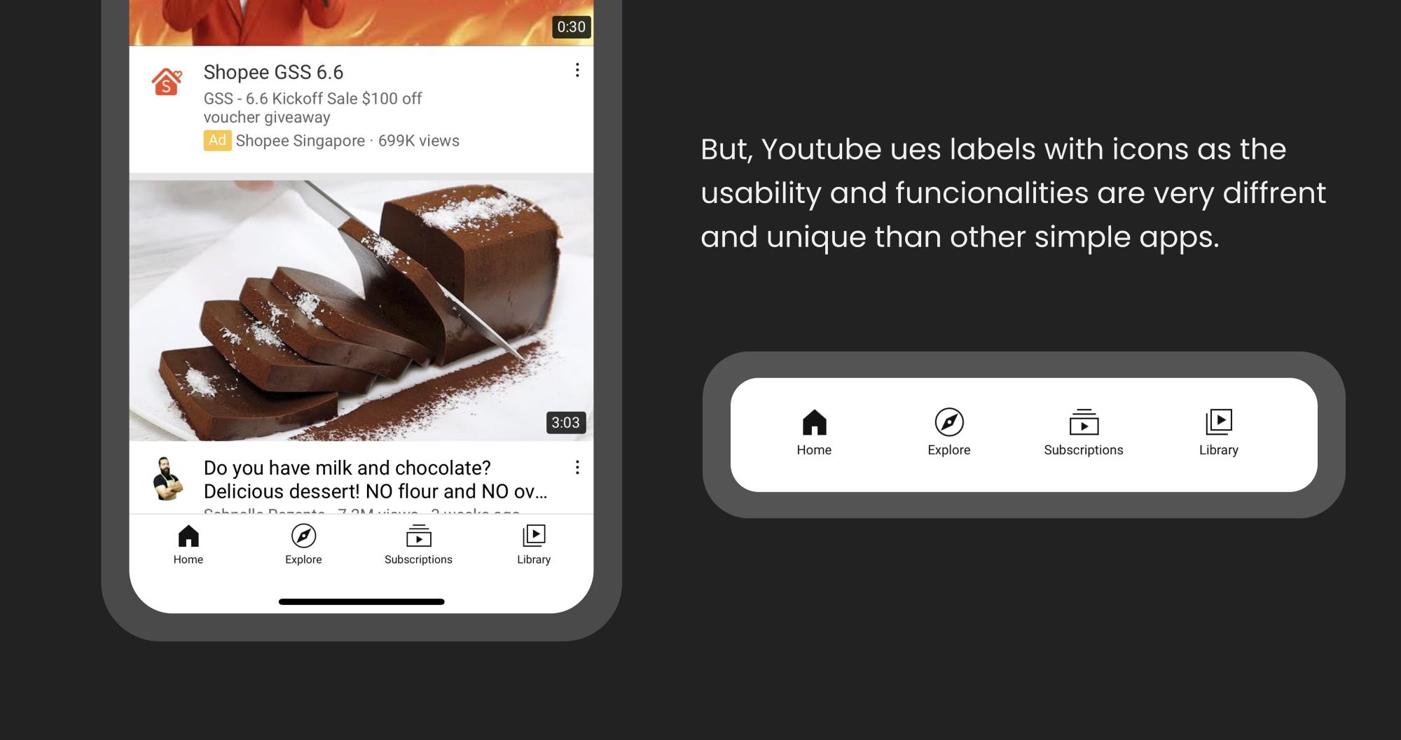 Youtube和宜家的App有不同类型的复杂性,宜家的App主要是用于购买家具,没有用文字,用户也能直观的理解,Youtube也有点复杂,因此他们添加了文字标签,如果只放图标可能会看不懂,尤其是对于新用户。