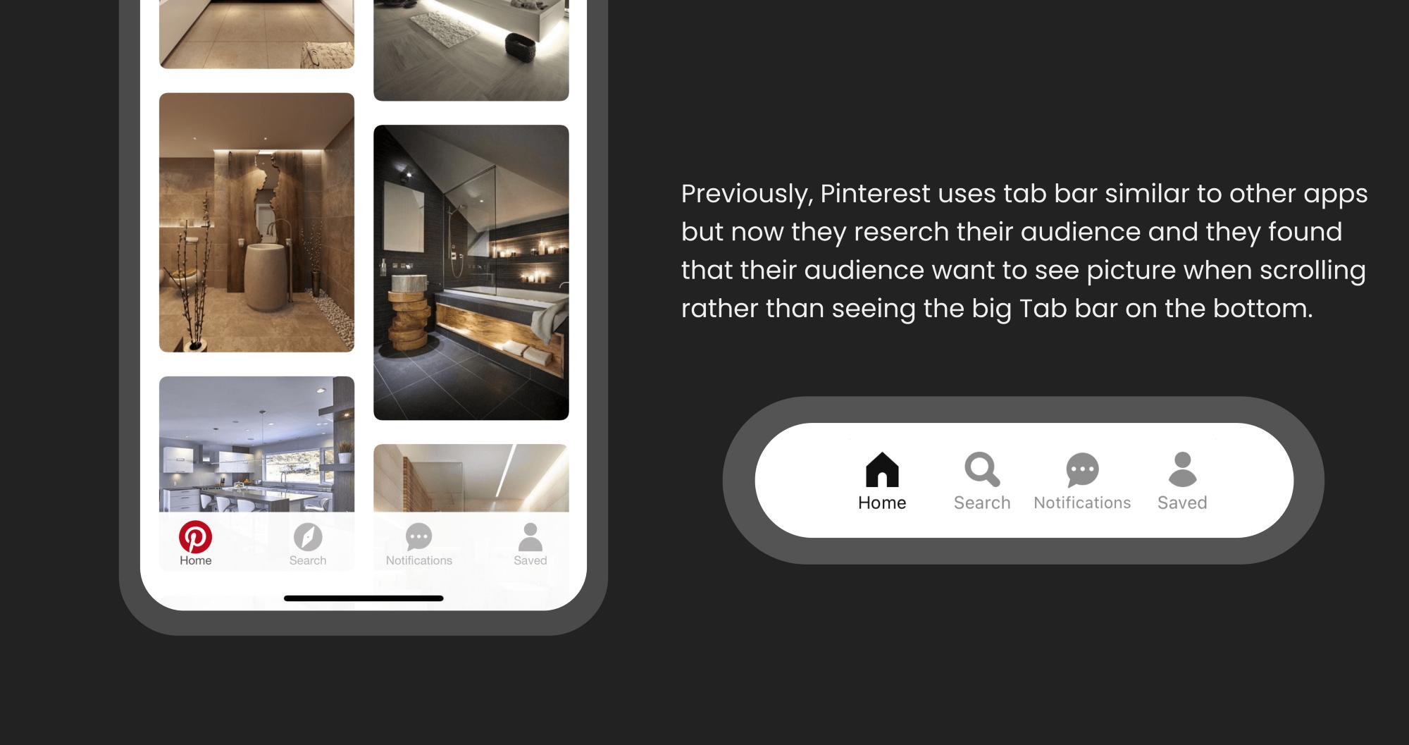 Pinterest测试了它的导航栏,他们在用户滑动时候隐藏导航栏,这可能是因为用户不希望看图片的时候还有导航栏,这只是一个猜测。