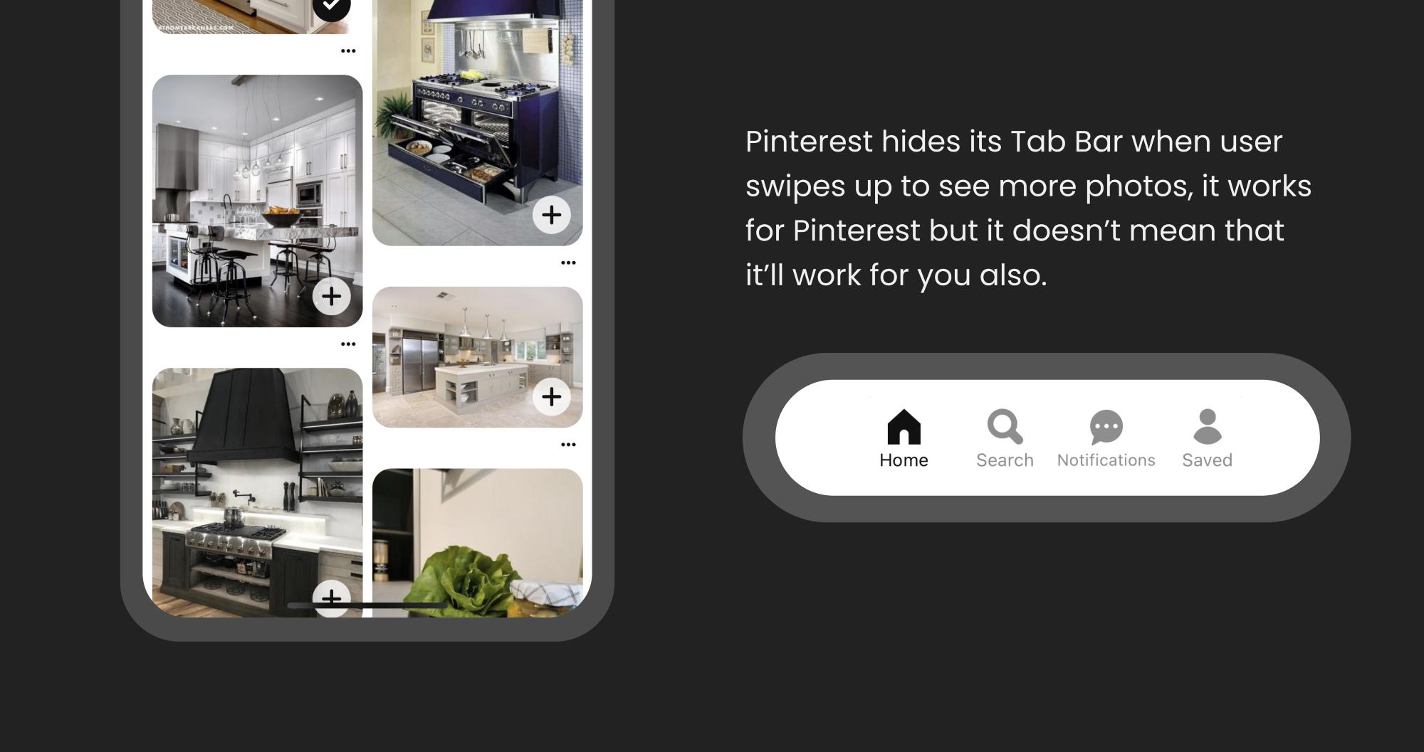 Pinterest在用户滑动图片的时候隐藏导航栏,但这不一定适用于你的App。