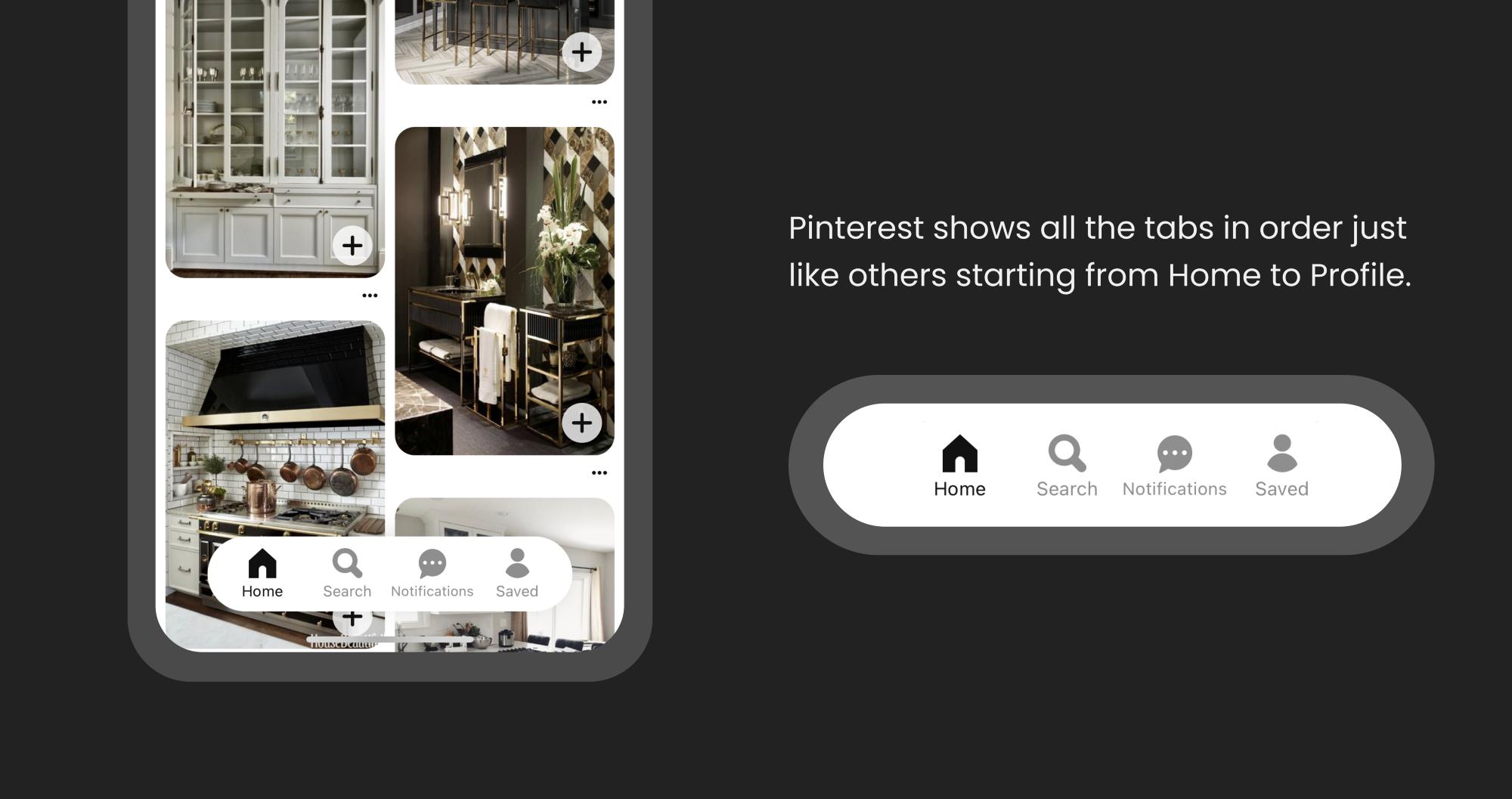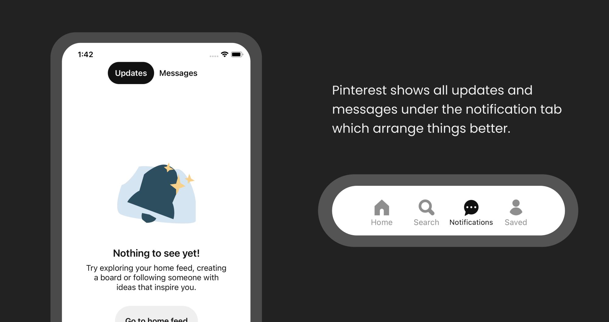 向Pinterest学习,Pinterest在导航栏上只有四个Tab,这有助于用户轻松地点击,令人敬佩的是,Pinterest也遵循内置的标签系统,这有助于在一个特定的Tab中添加几个Tab,比如在通知标签中添加一个消息标签。