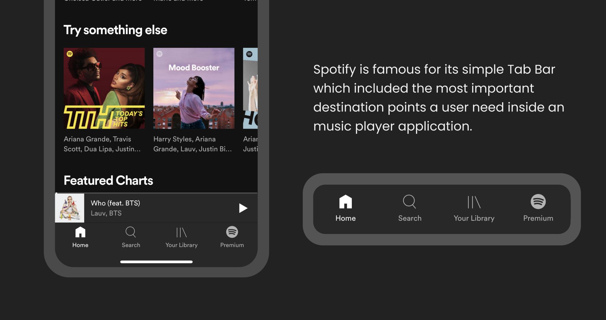 Spotify使用了每个音乐播放器App都需要的简单的导航栏,主标签用于播放或探索收听的内容,搜索标签用于搜索新歌曲和播客,音乐库标签用于播放列表中你喜欢的和保存的歌曲,以及会员标签,这对Spotify很有用,因为用户可以轻松地点击标签并立即付款成为会员。