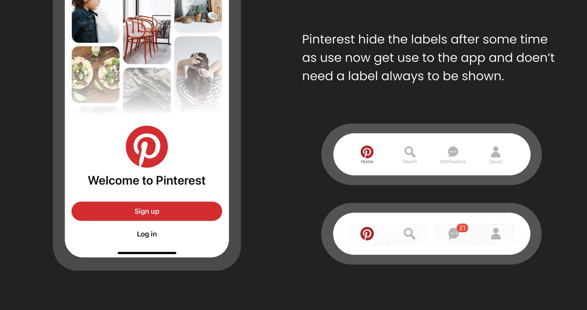 在设计带有文字的导航栏方面,Pinterest是行家,因为他们在用户长期习惯后会隐藏文字,我个人喜欢这样,因此我也推荐这样做,但这一切都取决于你。